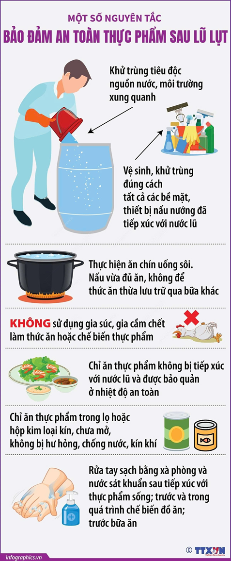 - Các gia đình cũng cần chú ý đến thực phẩm dự trữ cho trẻ nhỏ, phụ nữ có thai và những người già yếu; không chế biến thực phẩm trực tiếp trong môi trường nước bị ngập lụt; bảo vệ khu vực bếp và thực phẩm tránh khỏi các loại côn trùng, sâu bọ và các động vật khác. Ngoài ra, những người bị tiêu chảy hoặc có các biểu hiện khác phải tránh xa khu vực chế biến thực phẩm…