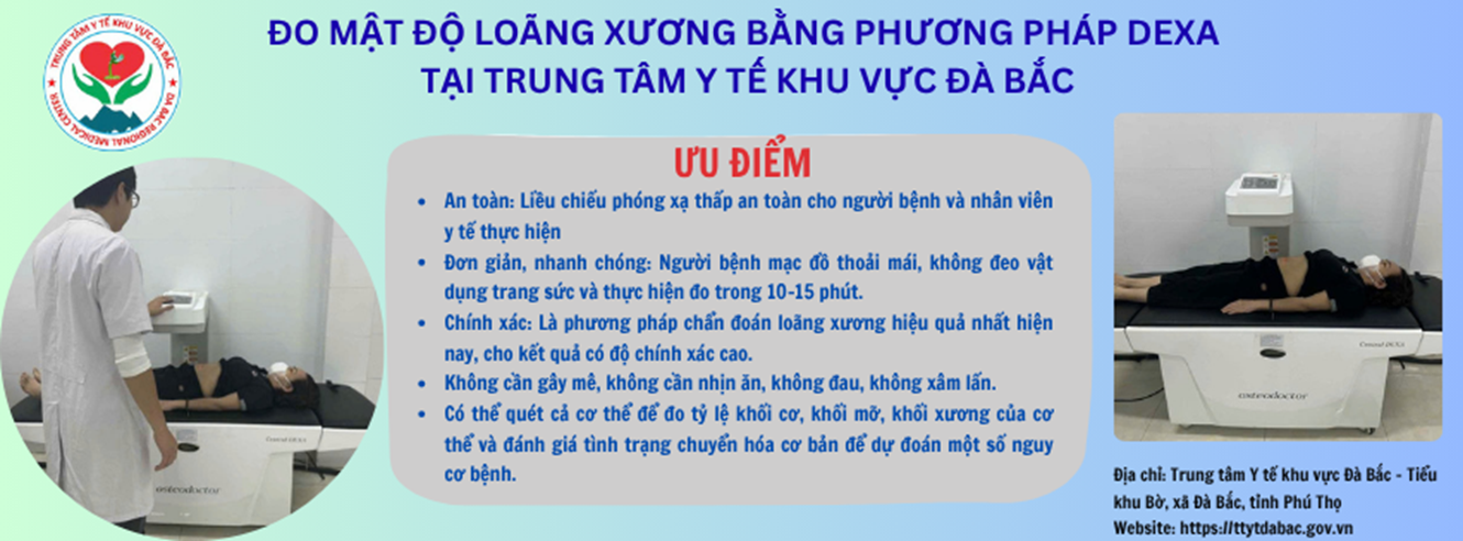 Đo loãng xương bằng phương pháp DEXA là một là phương pháp phổ biến nhất, phương pháp này dùng tia X để đo hàm lượng canxi và các khoáng chất khác có trong xương; Mật độ xương càng cao thì xương càng chắc khỏe và nguy cơ gãy xương càng thấp.