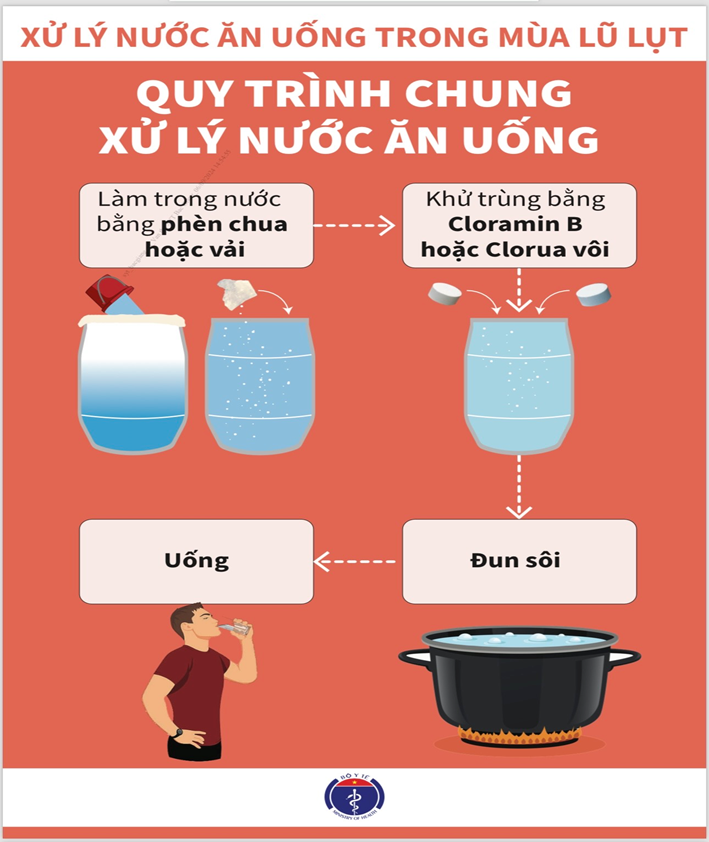 Khử trùng bằng hoá chất bột (Cloramin B, Clorua vôi): thường để khử trùng các nguồn nước cấp cho tập thể, các giếng nơi tập trung dân tránh lũ.