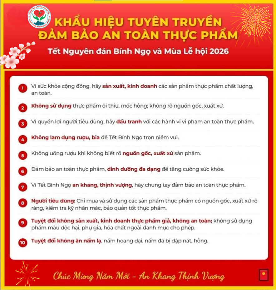 Nhằm nâng cao nhận thức, trách nhiệm của các cơ sở sản xuất, kinh doanh, chế biến thực phẩm và mỗi người dân trong việc chủ động phòng ngừa ngộ độc, bảo vệ sức khỏe bản thân, gia đình và cộng đồng, ngành Y tế tỉnh Phú Thọ triển khai đợt cao điểm tuyên truyền, lan tỏa thông điệp “An toàn thực phẩm vì sức khỏe cộng đồng” thông qua các khẩu hiệu trọng tâm sau: