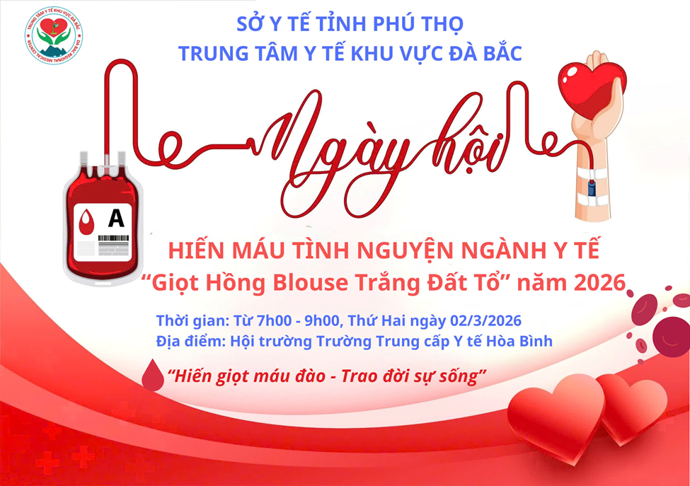 Trung tâm Y tế khu vực Đà Bắc kêu gọi toàn thể công đoàn viên, đoàn thanh niên, cán bộ, viên chức, người lao động và học viên đủ điều kiện sức khỏe tích cực đăng ký, tham gia Ngày hội hiến máu tình nguyện Ngành Y tế năm 2026, góp phần mang lại sự sống, niềm tin và hy vọng cho người bệnh.